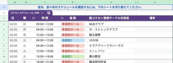 現在、施設利用状況は最新情報をリアルタイムでご確認いただけるよう、Googleスプレッドシートにて公開しております。